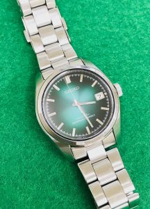 →グラデーションがかかったグリーンの文字板が綺麗な時計です。
